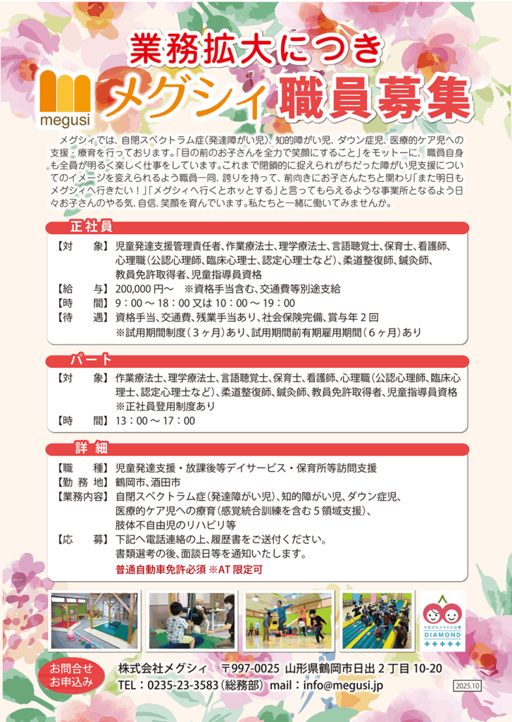 問い合わせ 株式会社メグシィ ℡0235-23-3583(総務部) info@megusi.jp